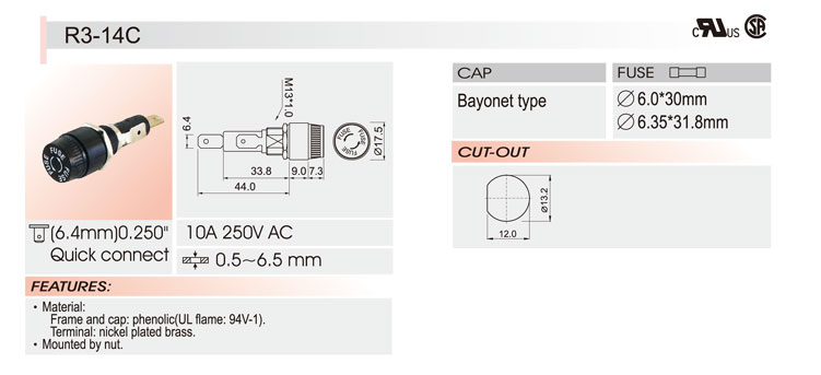 6*30面板安裝保險(xiǎn)絲座 R3-14C UL CSA 10A250V