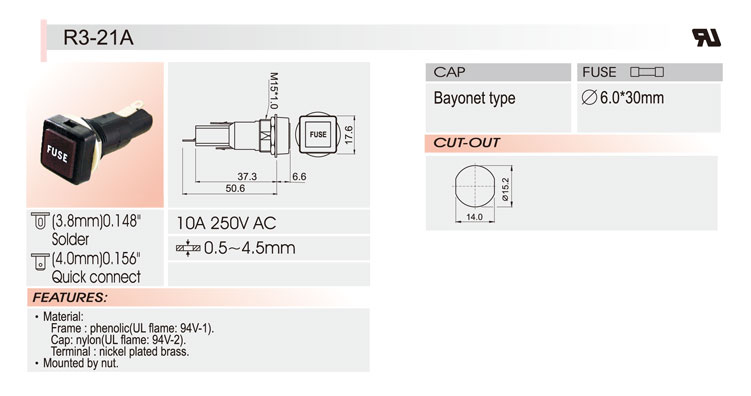 6*30 面板安裝保險絲座 R3-21A UL CSA 10A250V