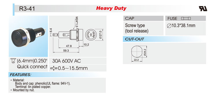 10*38面板安裝保險絲座 R3-41 UL CSA 30A600V