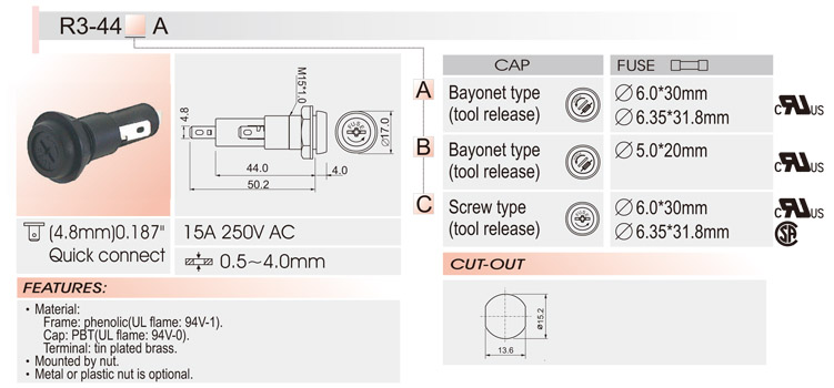 5*20/6*30 面板安裝保險(xiǎn)絲座 R3-44 UL CSA 15A250V