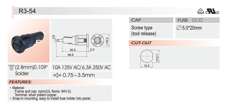 5*20面板安裝保險(xiǎn)絲座 R3-54A VDE UL CSA 10A250C