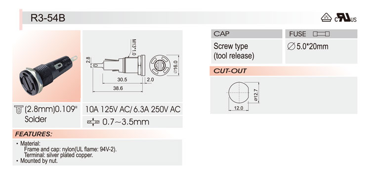 5*20面板安裝保險(xiǎn)絲座 R3-54B VDE UR CSA 10A250V