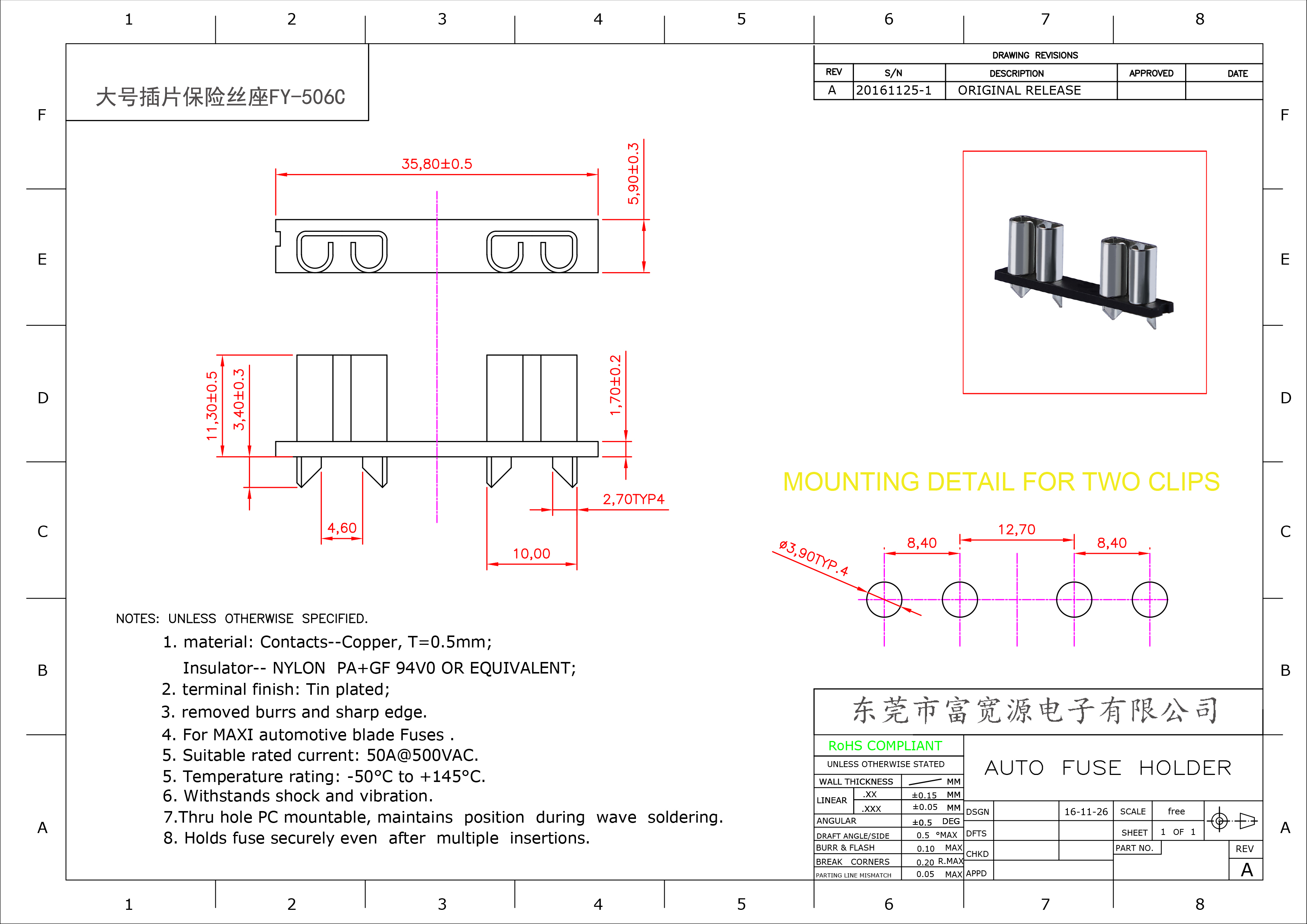 東莞市富寬源電子有限公司(東莞市富源電子科技有限公司)成立于1998年,主要從事安規(guī)元器件生產(chǎn)和銷售,通過10年的改革和努力現(xiàn)在的富寬源已經(jīng)成為集生產(chǎn)和銷售為一體的安規(guī)元器件總匯;富寬源將繼續(xù)秉持品質(zhì)第一、服務(wù)客戶的原則不斷為廣大客戶提供質(zhì)優(yōu)價廉的產(chǎn)品。我公司目前主要提供如下產(chǎn)品: 電流保險絲-CurrentFuse 玻璃管電流保險絲 陶瓷管電流保險絲 貼片電流保險絲 電阻式保險絲 微型電流保險絲 高壓電流保險絲 直流電流保險絲 交流電流保險絲 SMD-貼片式自恢復(fù)保險絲 AI-插件式自恢復(fù)保險絲 保險絲座-Fuseholder ESTMF系列保險絲座 EDKFH系列保險絲座 SKPTF系列保險絲座 AUTO--汽車保險絲座 OPWOP系列保險絲座 拉線盒式保險絲座 保險絲夾&端子 保險管座 保險座 大電流|高壓保險座 溫度保險絲-Thermalcutoffs 方塊形溫度保險絲 電阻式溫度保險絲 大電流溫度保險絲 陶瓷溫度保險絲 鐵殼溫度保險絲 SW.C溫度保險絲 NEC溫度保險絲 艾默生溫度保險絲 內(nèi)橋溫度保險絲 松下溫度保險絲 AUPO溫度保險絲 溫度開關(guān)/溫控器-Thermalprotector 熱保護器/可恢復(fù)溫控器 風(fēng)筒式溫控開關(guān)/溫控器 馬達(dá)熱保護器/溫控器 除霜除濕溫控器/溫控開關(guān) 超低溫溫控開關(guān)/溫控器 微型溫控開關(guān)/溫控器 溫度開關(guān)/溫控器-Thermalprotector 7AM/17AM溫控器 KSD301系列溫開關(guān) KSD-01F插腳溫開關(guān) 9700系列方塊形溫控開關(guān) BR系列溫控開關(guān) SEKIST-22溫控器 壓敏電阻-Varistors 壓敏電阻 氧化鋅壓敏阻器 貼片壓敏電阻 SMD壓敏電阻 插件型壓敏電阻 高能壓敏電阻 汽車保險絲Autofuse/carfuse 小號汽車插片保險絲FY-MIN 中號汽車插片保險絲FY-ATC 大號汽車插片保險絲FY-MAX 小號叉栓式汽車保險絲FY-UF 大號汽車叉栓式保險絲FY-MF 管狀|柱狀汽車保險絲 其他型號汽車保險絲 過載保護器-CIRCUITBREAKER AR1/AR2系列過載保護器 W系列過載保護器 88/88A系列過載保護器 90系列過載保護器 91/91L系列過載保護器 97/98/98H系列過載保護器 帶開關(guān)系列過載保護器 熱敏電阻-NTC/PTCThermistor 負(fù)溫度系數(shù)熱敏電阻 陶瓷正溫度系數(shù)熱敏電阻 高分子正溫度系數(shù)熱敏電阻 溫度傳感器 濕度傳感器 本公司將繼續(xù)通過ISO9000質(zhì)量管理體系的有效實施,使涉及企業(yè)生產(chǎn)經(jīng)營的各個運作環(huán)節(jié),均嚴(yán)謹(jǐn)有序,不斷制造出質(zhì)優(yōu)價廉、適銷對路的產(chǎn)品參與市場競爭,使企業(yè)長期保持較強的經(jīng)營獲利能力。同時我們將長期重視與行業(yè)知名企業(yè)合作,爭取最大限度的代理權(quán),以最優(yōu)惠的價錢把產(chǎn)品銷售給客戶。