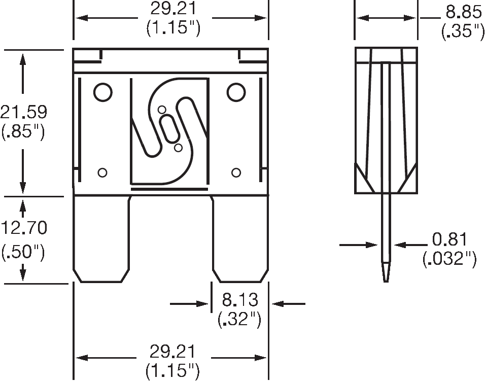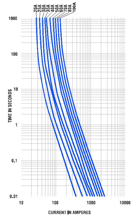Voltage Rating: 63 VDC Interrupting Ratings: 1000A @ 63 VDC Operating Temperature Range: -40ⅹC to +125ⅹC Terminals: Ag plated zinc alloy Housing Material: PA66 Complies with: SAE J 1888 ISO 8820-3:2002(E) Time-Current Characteristics
