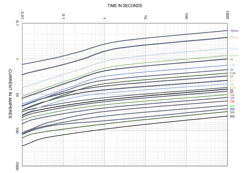 Notes: 1. Derating depicted in this curve is in addition to the standard derating of 20% for continuous operation. Example:For continuous operation at 75 degrees celsius, the fuse should be derated as follows:I = (0.80)(0.85)IRAT= (0.68)IRAT Average Time Current Curves