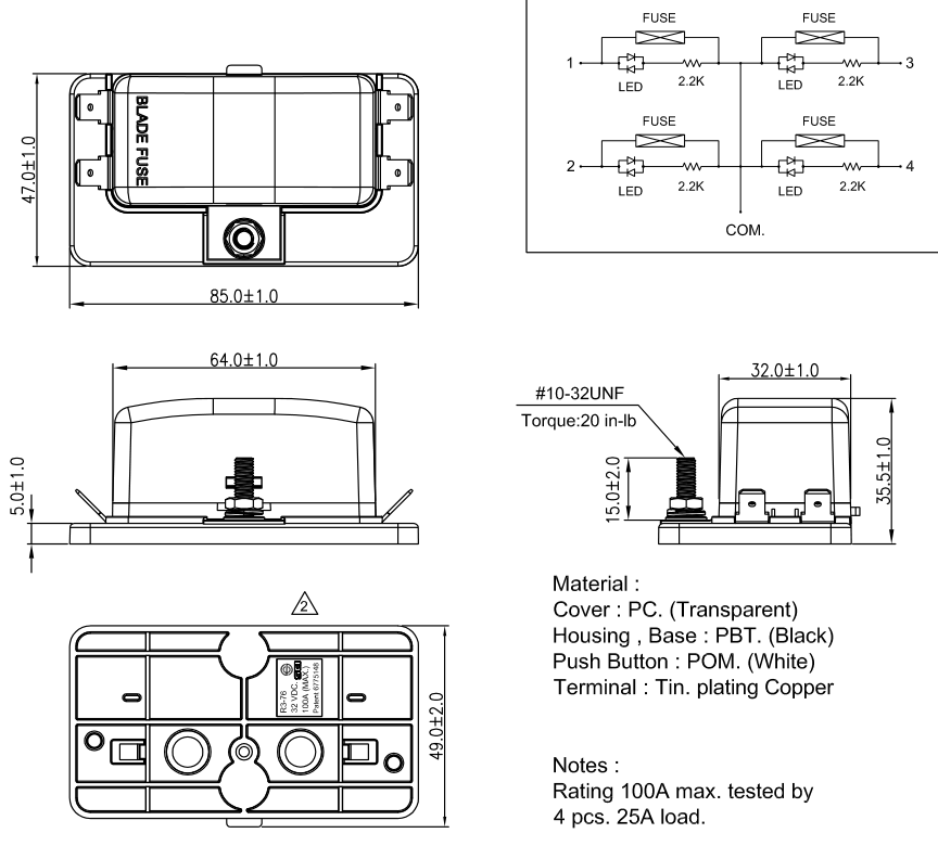 1.適合船舶、房車或外部裝修類型應(yīng)用的保險絲盒,透明防護罩防水防塵、污垢進入 2.保險絲損壞時,紅色 LED 指示, 按下閂鎖即可輕鬆打開